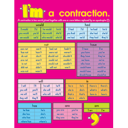 The colorful chalkboard design of this Contractions Chart is sure to capture the attention of your students while providing reinforcement of this valuable language arts skill