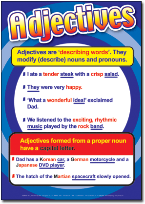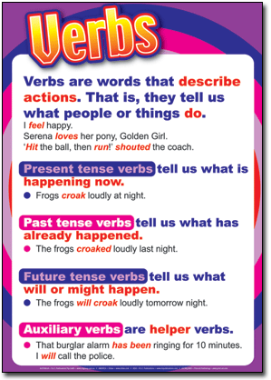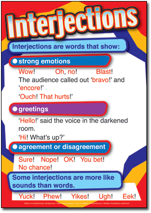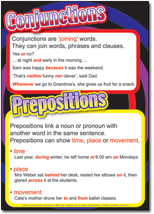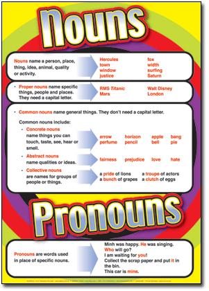 A set of six boldly coloured posters aimed at consolidating the most common parts of speech – nouns and pronouns, verbs, adverbs, adjectives, conjunctions and prepositions, interjections – with comprehensive definitions and examples.