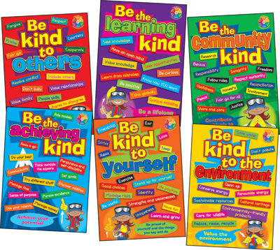 A set of six A2-sized laminated posters with appealing graphics and definitions promoting the values of cooperation, honesty, kindness, perseverance, responsibility and tolerance. Teachers notes on the reverse offer explanations of the graphics, background information for the teacher, a variety of suggested activities and a blackline for students.